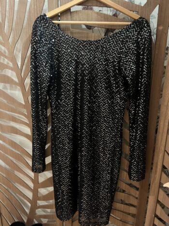 Robe de fête noire à sequins – LA pièce qui fait tourner toutes les têtes ! ✨ Entièrement recouverte de sequins noirs, décolleté V cache-cœur très flatteur, manches longues, taille marquée avec un joli drapé/nœud sur le côté qui affine la silhouette. Coupe courte (mi-cuisses), légèrement patineuse. Ultra féminine et élégante tout en restant sexy. Parfaite pour Noël, le Réveillon, un mariage, un anniversaire chic ou toute soirée où tu veux briller littéralement.