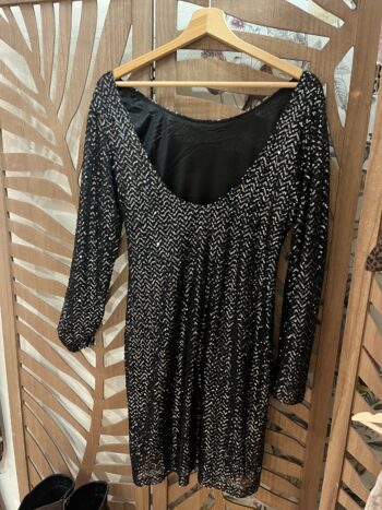Sublime robe courte à sequins noirs et argentés, motif chevrons ultra brillant qui capte la lumière à chaque mouvement.