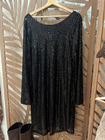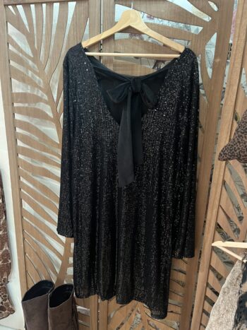 Robe de soirée à sequins noirs totalement canon ! Entièrement recouverte de milliers de petits sequins noirs brillants qui font un effet miroir sublime sous les lumières. Manches longues, coupe droite légèrement évasée, longueur mini/mi-cuisses. Le détail qui tue : grand décolleté dos en V avec un magnifique nœud en satin noir qui tombe élégamment dans le dos. Ultra sexy et chic à la fois ! Parfaite pour Noël, le Nouvel An, un mariage, un gala ou simplement quand tu veux voler la vedette.