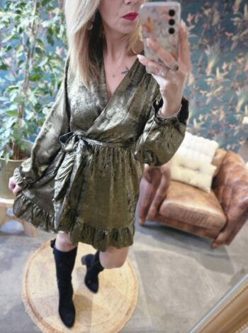 Tissu fluide ultra brillant bronze/or vieilli, avec de magnifiques reflets changeants. Décolleté V cache-cœur, manches longues resserrées aux poignets, taille élastiquée + ceinture à nouer pour une silhouette de rêve. Jupe courte avec petit volant en bas qui donne un côté léger et dansant. C’est LA robe qui te transforme en déesse des soirées de fin d’année, mariage, anniversaire ou tout événement où tu veux être inoubliable.