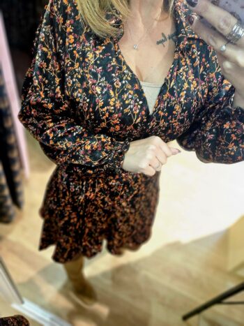 Robe courte col V, noir imprimé fleurs violettes. Coupe empire froncée sous poitrine, manches longues bouffantes, grandes tailles. Élégance féminine et fluide assurée.