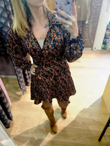 Élégante et féminine, cette robe noire à fleurs séduit par son col chemise raffiné et sa coupe cache-cœur qui met subtilement la silhouette en valeur. Son tissu fluide assure un tombé parfait pour un look chic et confortable, du bureau à la soirée.
