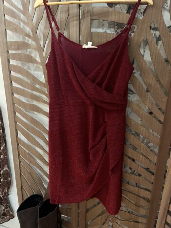 Magnifique robe courte rouge scintillante, effet portefeuille avec un joli décolleté en V qui sublime la poitrine. Tissu légèrement brillant qui capte la lumière à chaque mouvement, ultra flatteur pour la silhouette. Coupe près du corps en haut, légèrement évasée en bas pour un confort absolu et une démarche élégante. Idéale pour une soirée, un dîner ou un événement festif. Une petite robe rouge qui fait toute la différence !
