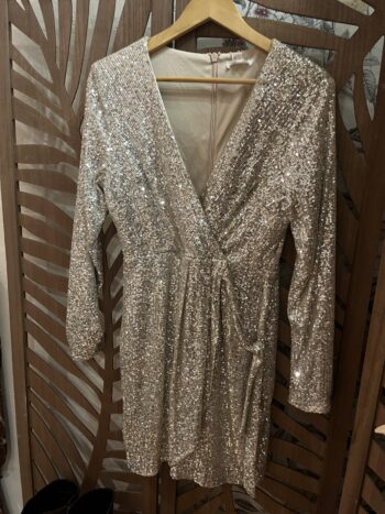 Robe de fête champagne/or rose à sequins – LA pièce qui fait tourner toutes les têtes ! Entièrement recouverte de sequins irisés, décolleté V cache-cœur très flatteur, manches longues, taille marquée avec un joli drapé/nœud sur le côté qui affine la silhouette. Coupe courte (mi-cuisses), légèrement patineuse. Ultra féminine et élégante tout en restant sexy. Parfaite pour Noël, le Réveillon, un mariage, un anniversaire chic ou toute soirée où tu veux briller littéralement.