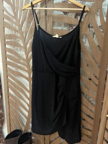 Magnifique robe courte noire scintillante, effet portefeuille avec un joli décolleté en V qui sublime la poitrine. Tissu légèrement brillant qui capte la lumière à chaque mouvement, ultra flatteur pour la silhouette. Coupe près du corps en haut, légèrement évasée en bas pour un confort absolu et une démarche élégante. Idéale pour une soirée, un dîner ou un événement festif. Une petite robe noire qui fait toute la différence !