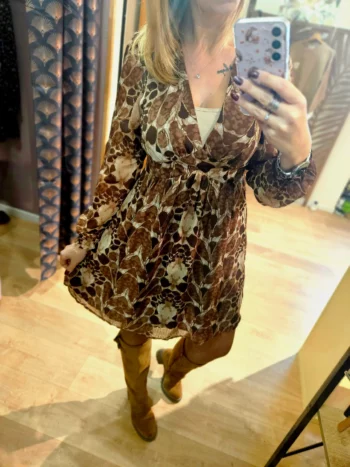 Cette robe chic marron séduit par sa coupe raffinée et son tombé élégant. Idéale pour un look sophistiqué et féminin, elle se porte aussi bien en journée qu’en soirée, apportant chaleur et style à votre tenue.