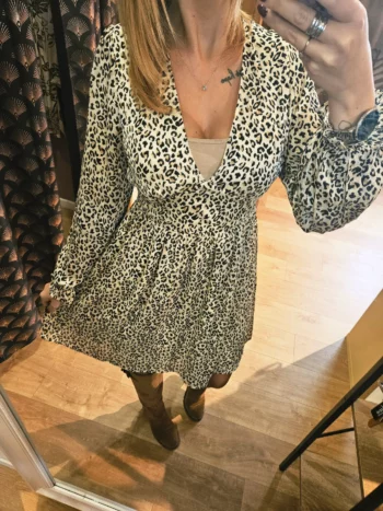 Osez le look chic avec cette robe à imprimé léopard. Sa coupe féminine et fluide met en valeur la silhouette tandis que le motif animalier apporte caractère et sophistication à votre tenue. Parfaite pour une allure audacieuse et élégante, du quotidien aux soirées.