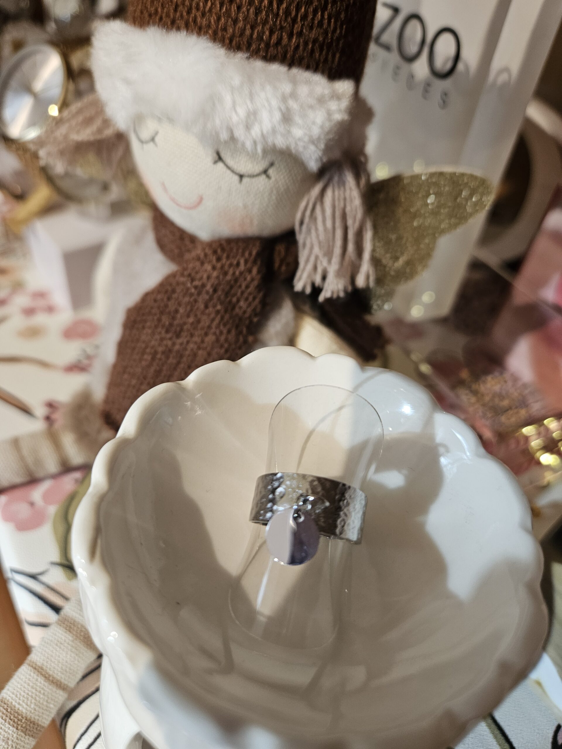 Bague ouverte en acier inoxydable argenté texturé martelé, ornée d’une petite pampille ronde pendante. Ajustable, chic et bohème. Lumineuse et facile à porter en solo ou en accumulation.