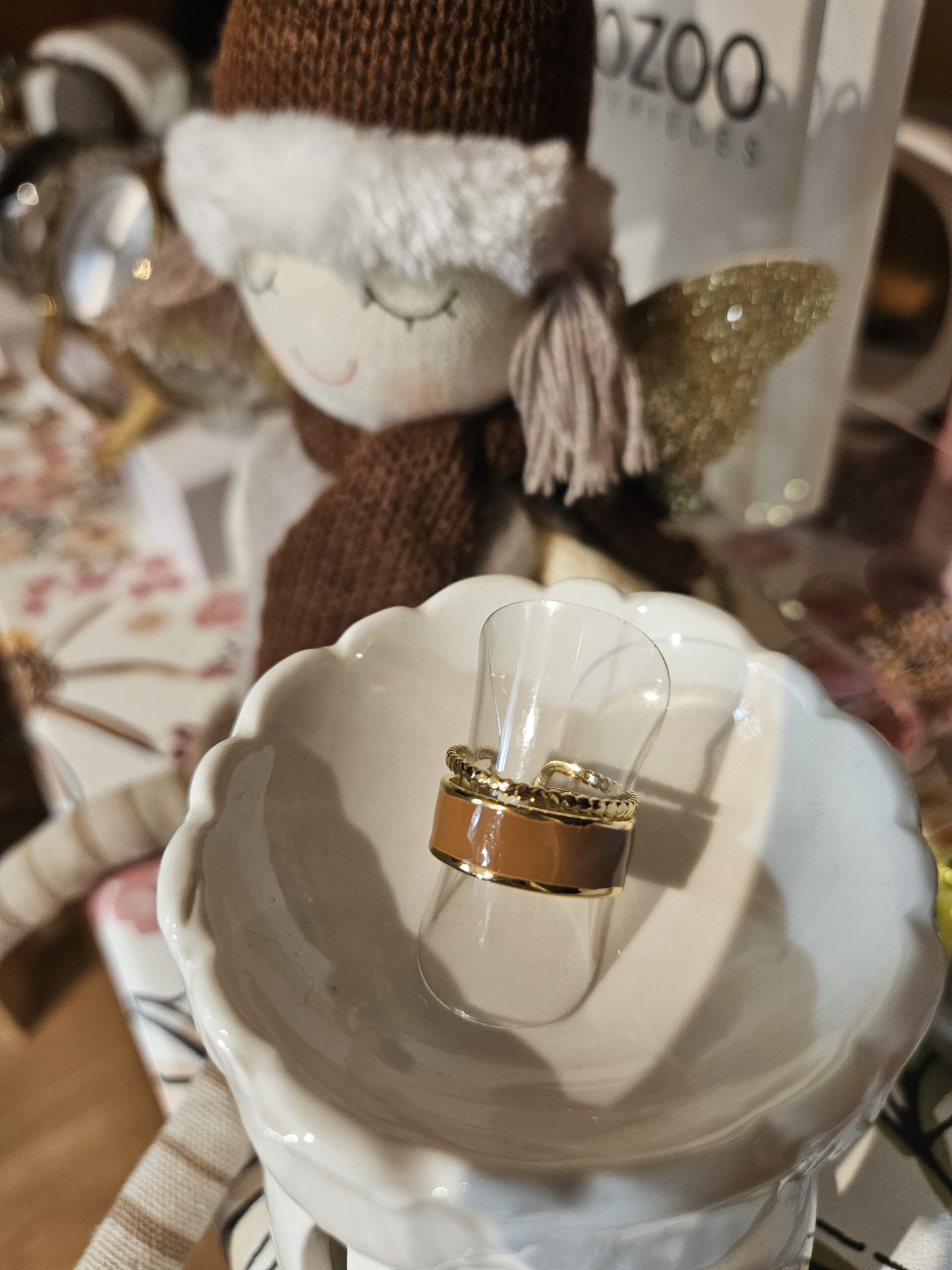 Bague large en émail camel satiné, bordures et détails dorés ciselés. Ajustable, audacieuse et élégante. Sublime avec des tons neutres ou dorés.