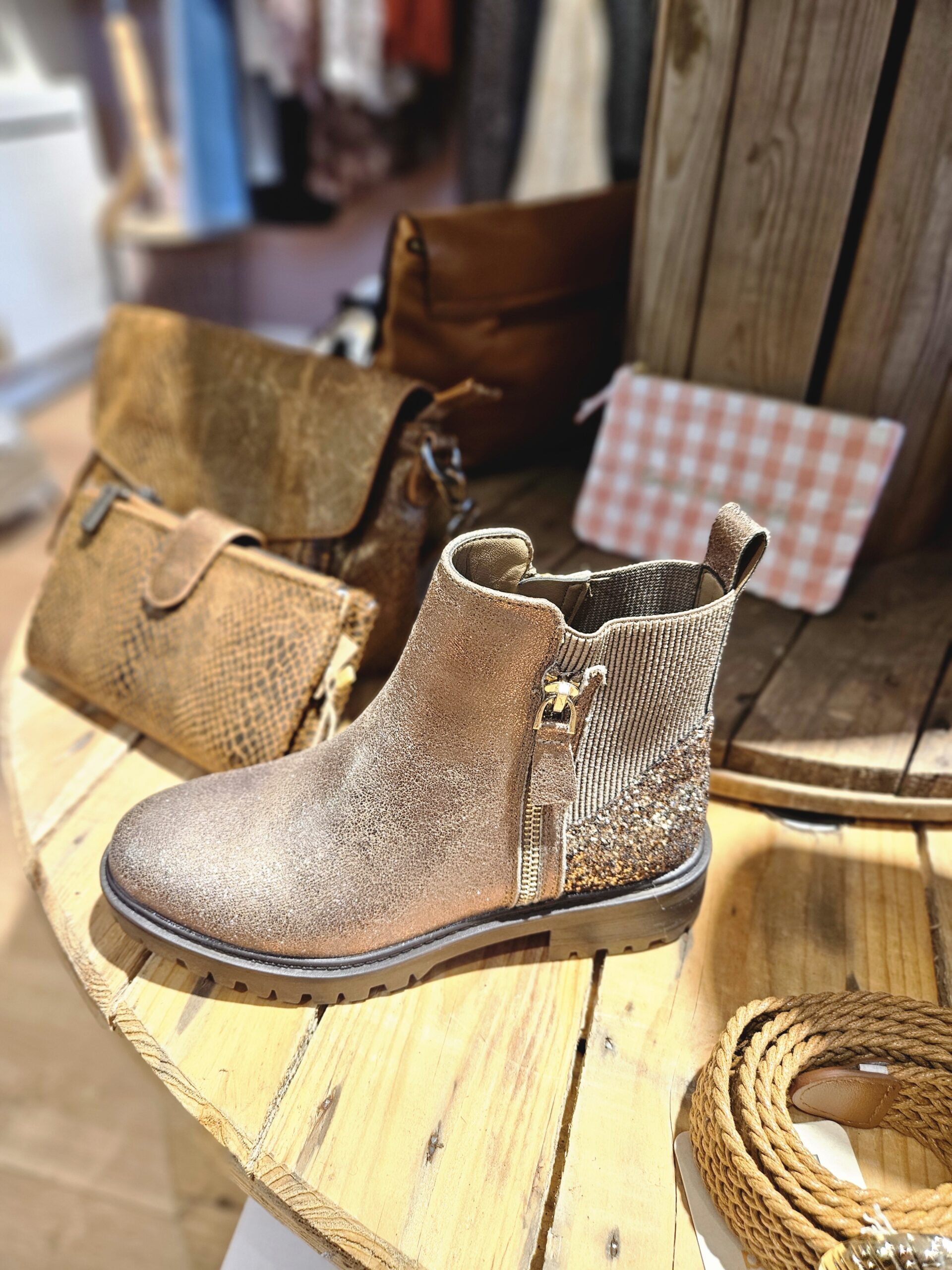 Bottines dorées – Scintillantes et faciles à enfiler, avec leur texture étincelante, leurs côtés côtelés et leur boucle dorée. Le mix parfait entre confort quotidien et éclat hivernal.