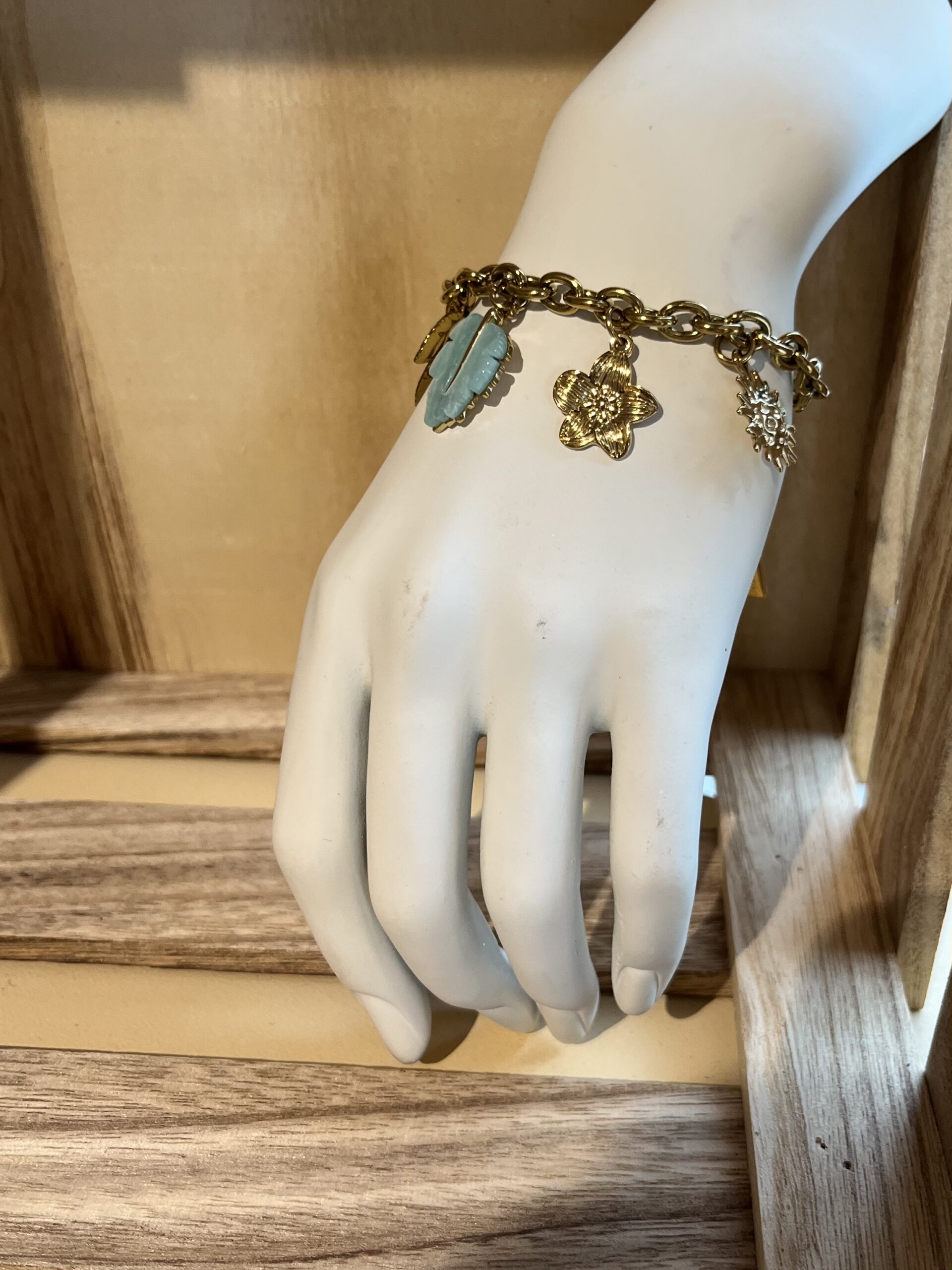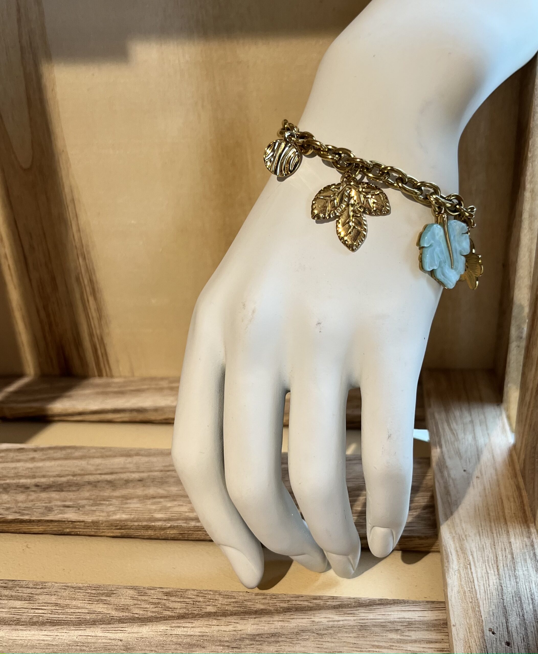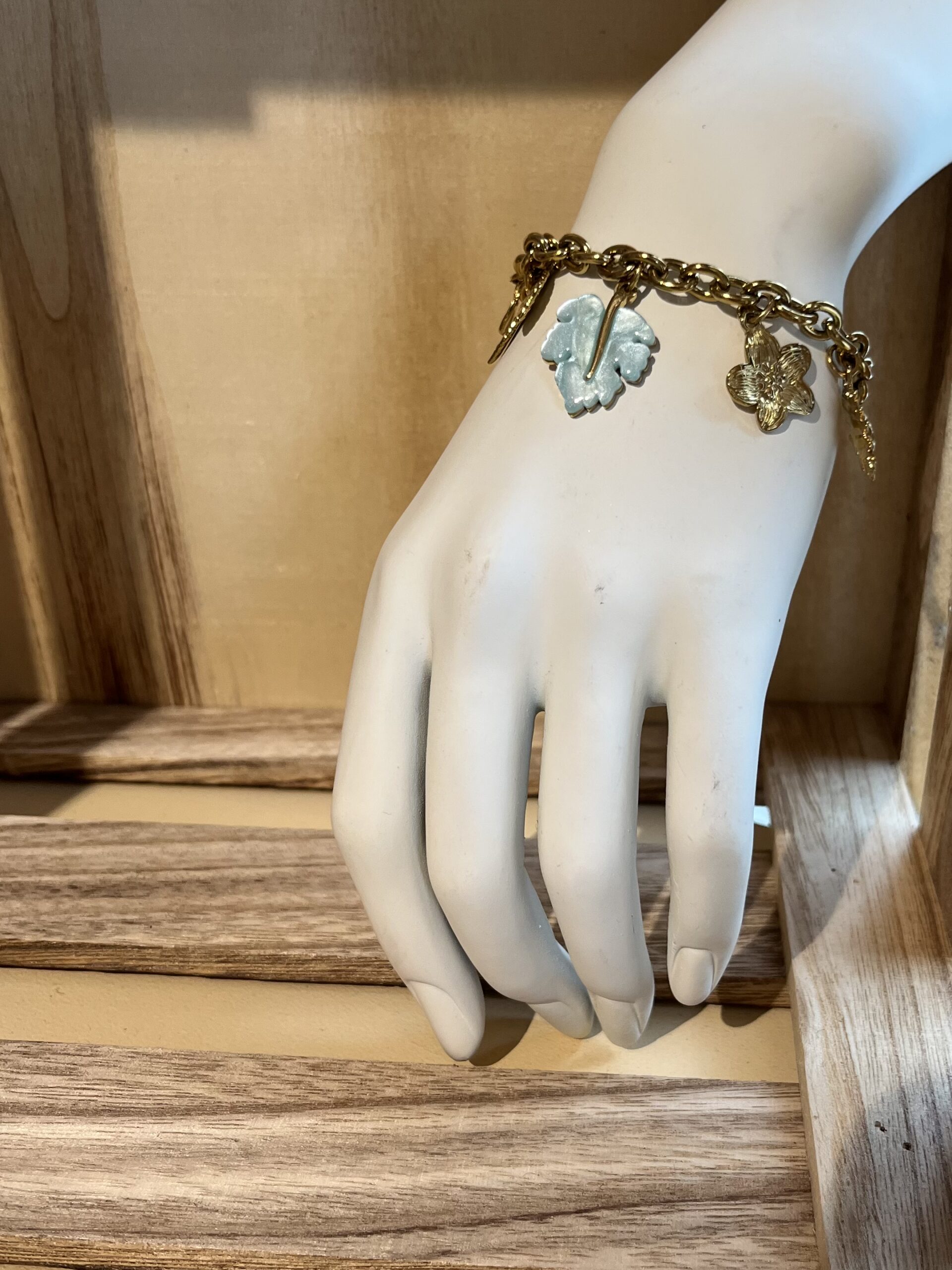 Ce bijou délicat arbore une feuille en émail turquoise, une fleur et d’autres charms minutieusement choisis. La chaîne fine et les breloques légèrement martelées captent la lumière à chaque mouvement pour un effet scintillant très féminin.