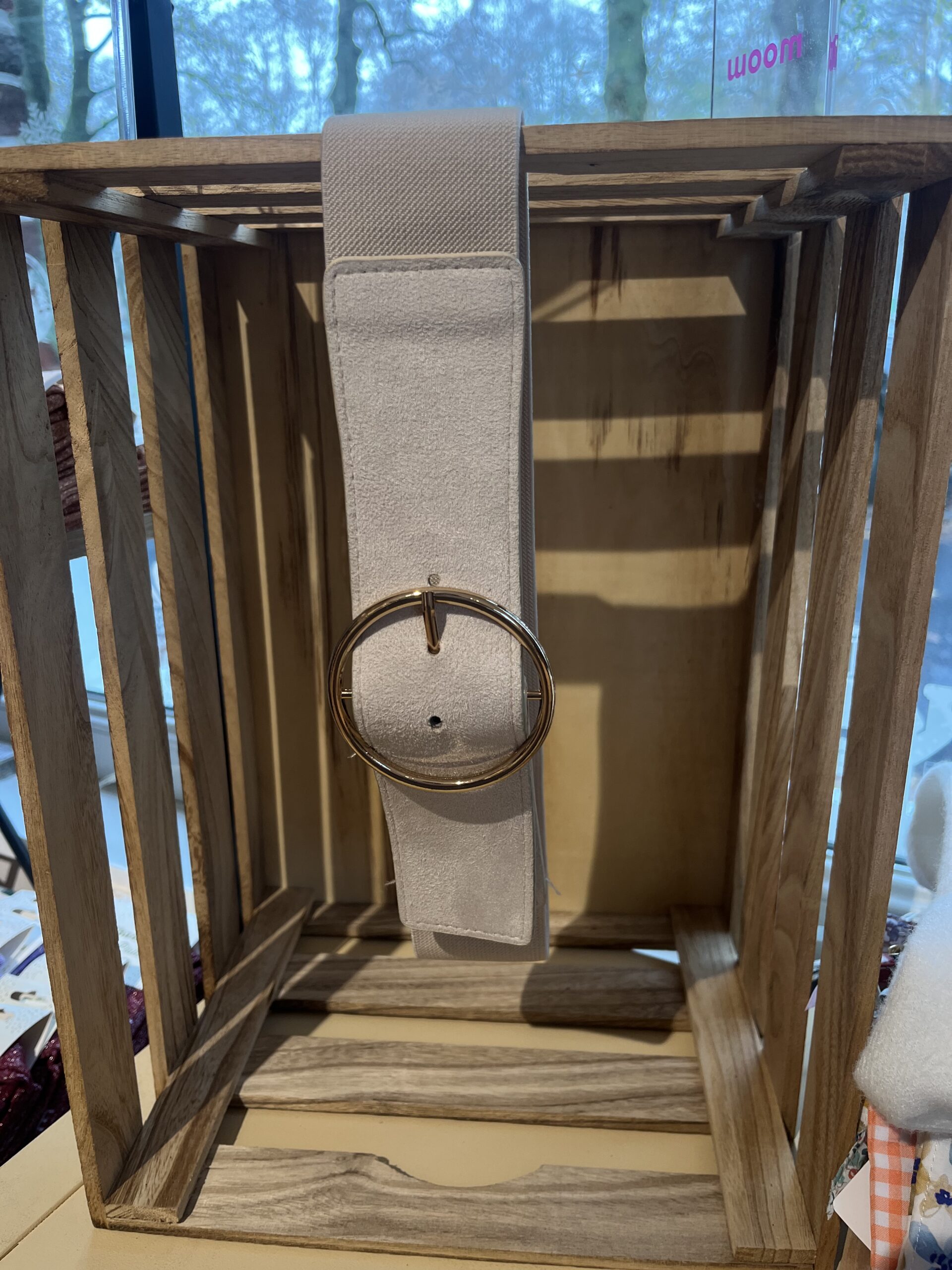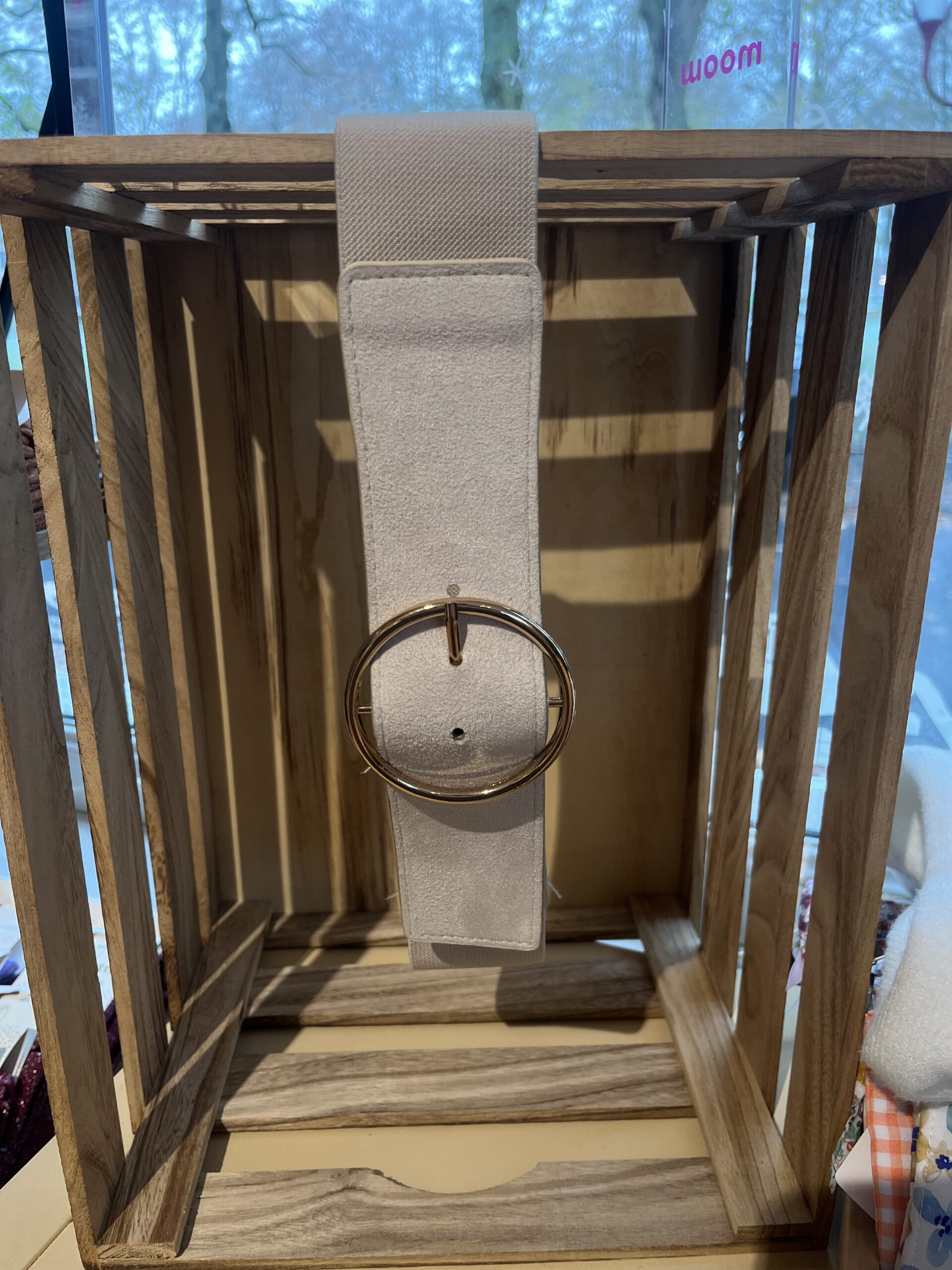 Suédine beige ultra douce avec boucle demi-lune dorée ciselée vintage. Pour un twist bohème chic instantané toute la journée
