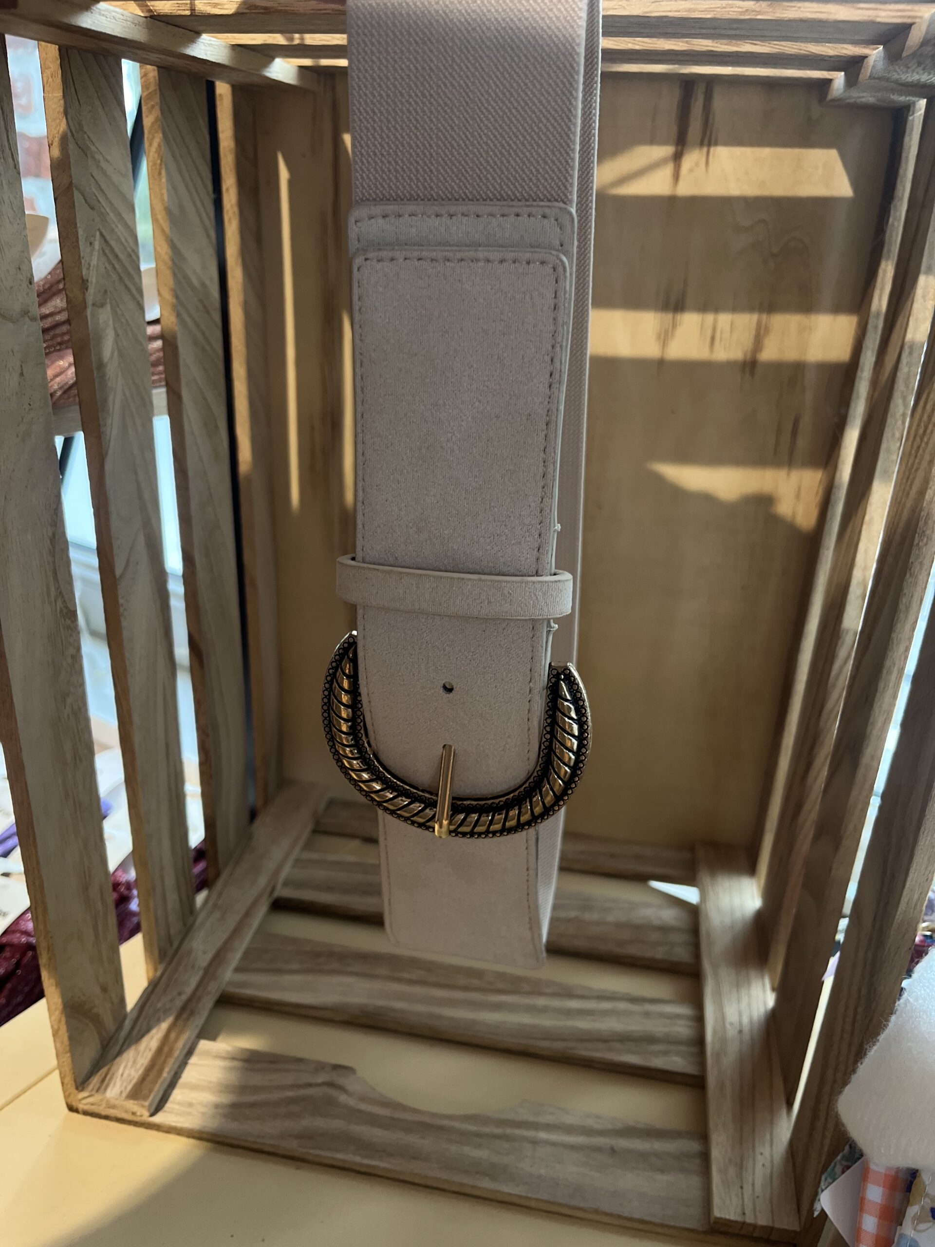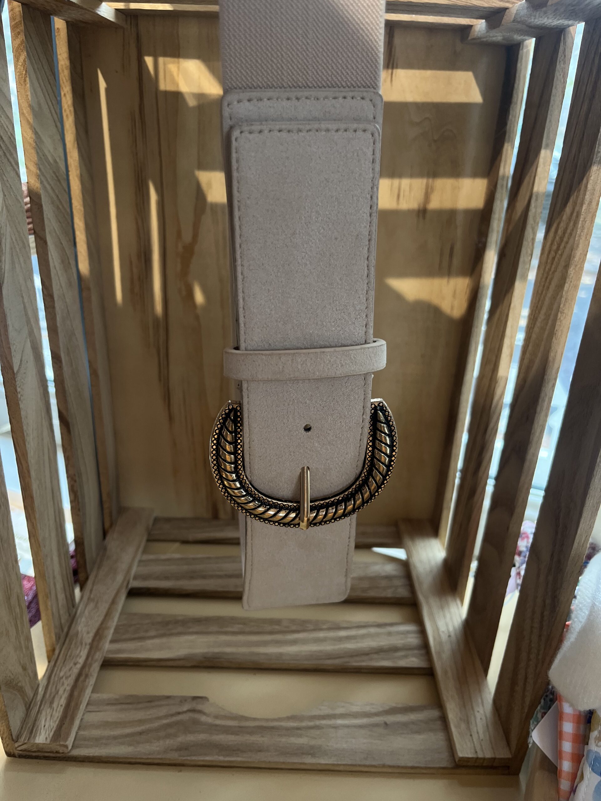 Suédine beige ultra douce avec boucle demi-lune dorée ciselée vintage. Pour un twist bohème chic instantané toute la journée