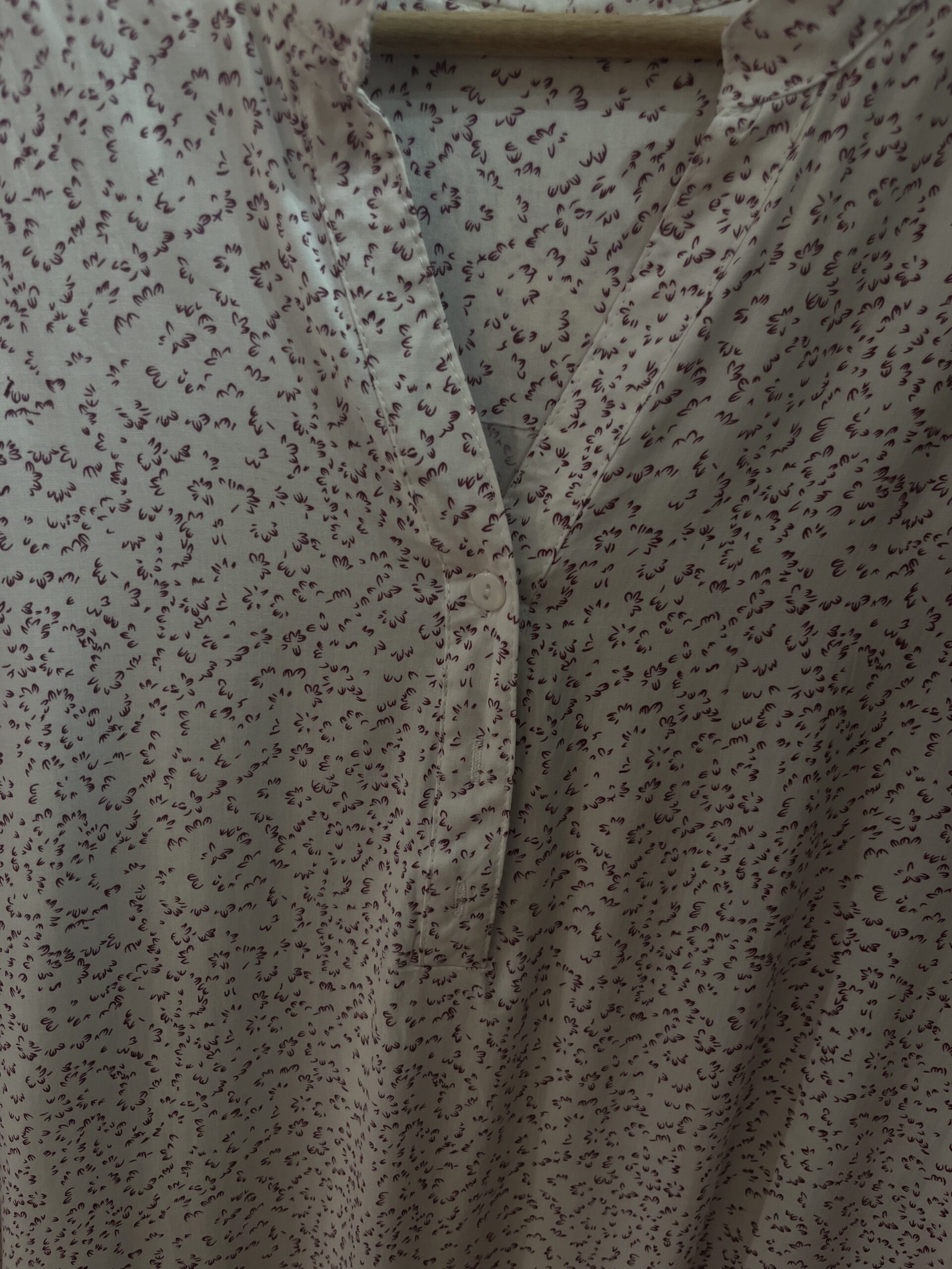 Très jolie blouse ultra douce et légère, couleur blanche avec un délicat imprimé de tout petits points et traits rose pâle. Effet romantique et lumineux, parfait pour un look doux et féminin.