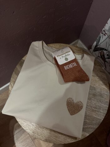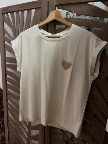 Un nuage de douceur et de tendresse à porter tous les jours ! Ce t-shirt beige ultra-doux 100% coton arbore un petit cœur brodé en fil doré légèrement brillant, placé côté cœur. Simple, raffiné et tellement touchant.