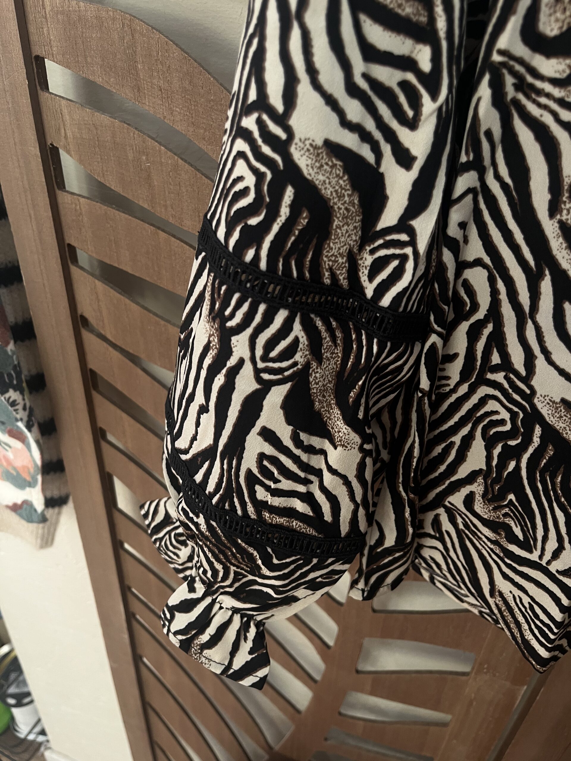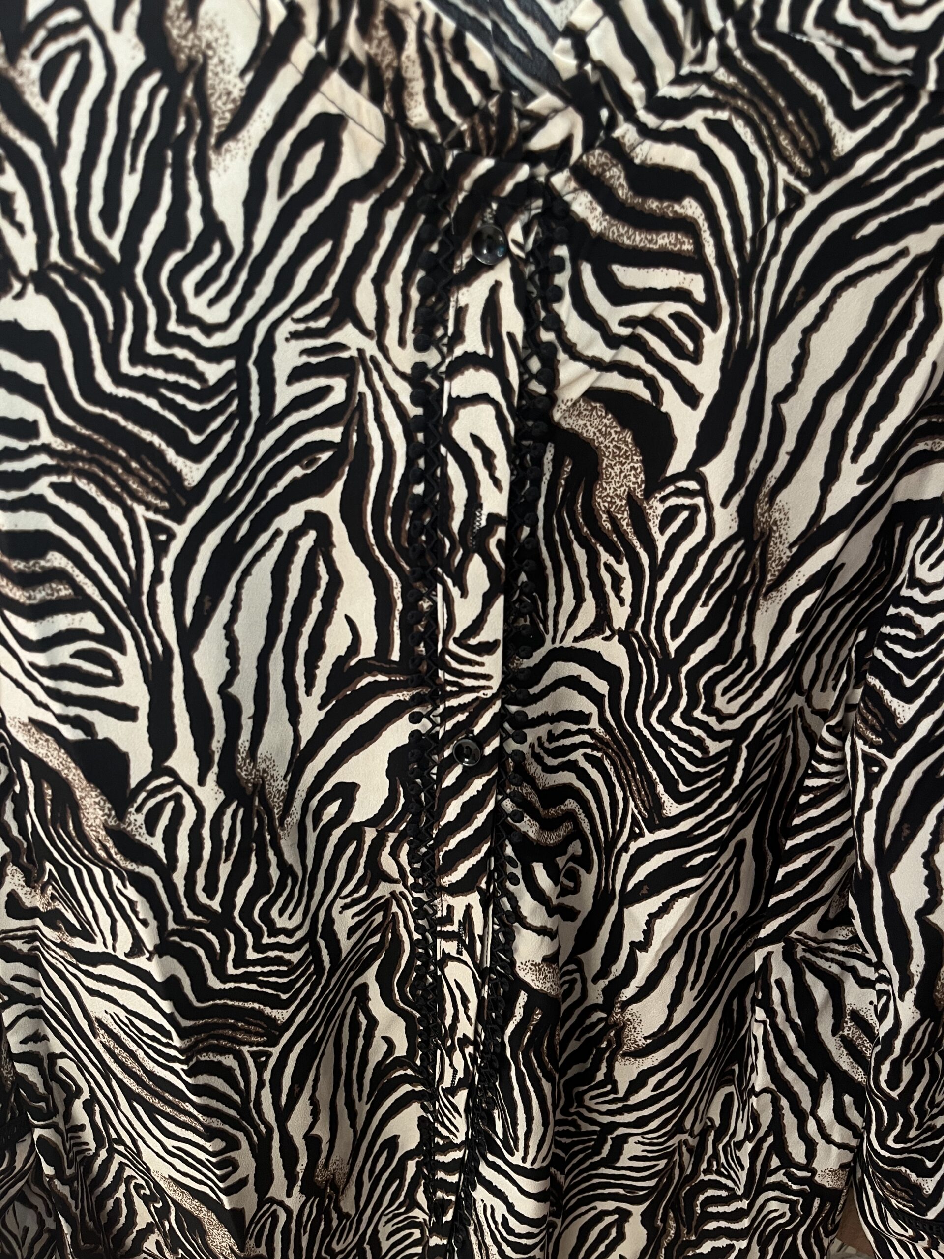 Magnifique blouse légère et aérienne à l’imprimé zèbre noir, beige et touches de marron subtilement dégradées. Le motif animalier est ultra tendance et intemporel à la fois.