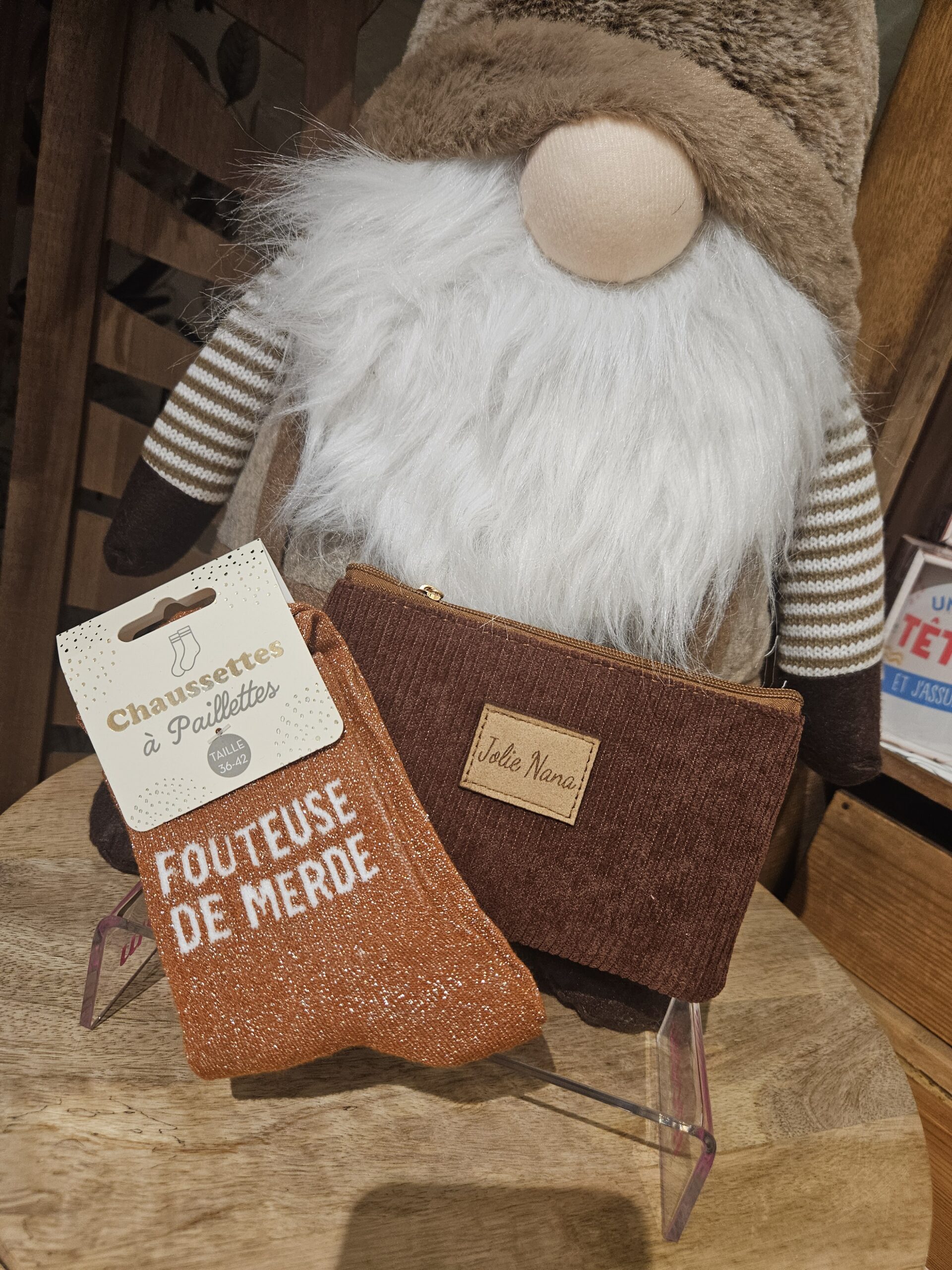 Coffret cadeau composé d’une paire de chaussettes pailletés « Fouteuse de merde » ainsi que d’une pochette à message «Jolie nana ».