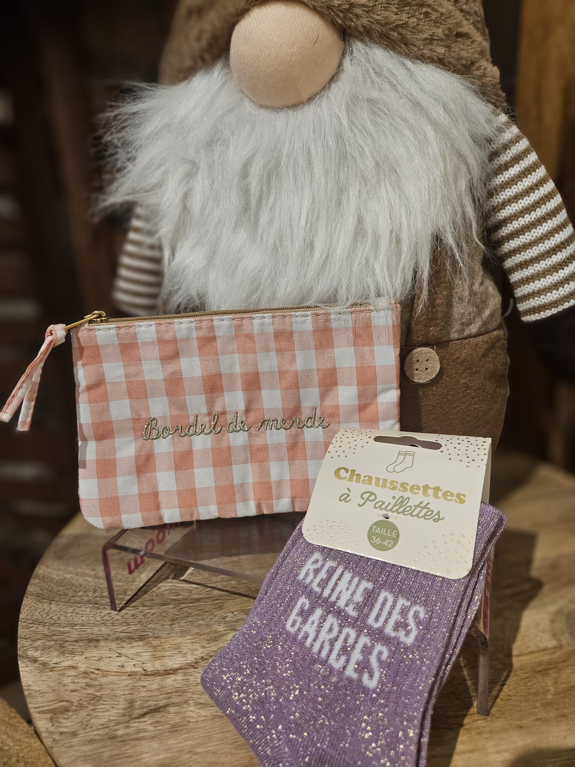 Coffret cadeau composé d’une paire de chaussettes pailletés « Team emmerdeuse » ainsi que d’une pochette à message « Bordel de merde ».