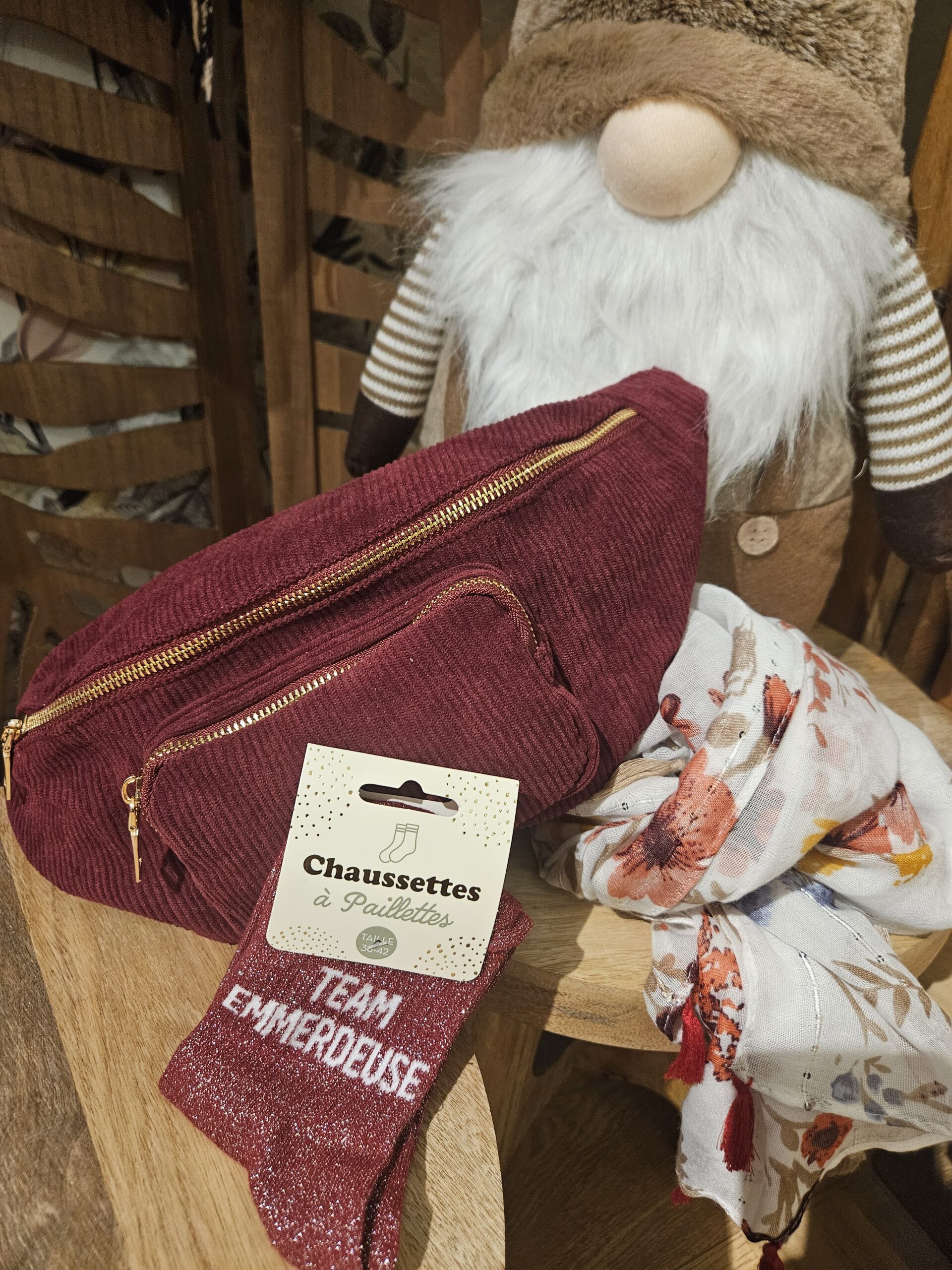 Coffret cadeau composé d’une paire de chaussettes pailletés « Emmerdeuse » ainsi que d’un sac banane en velours rouge et d’un foulard fleuri.