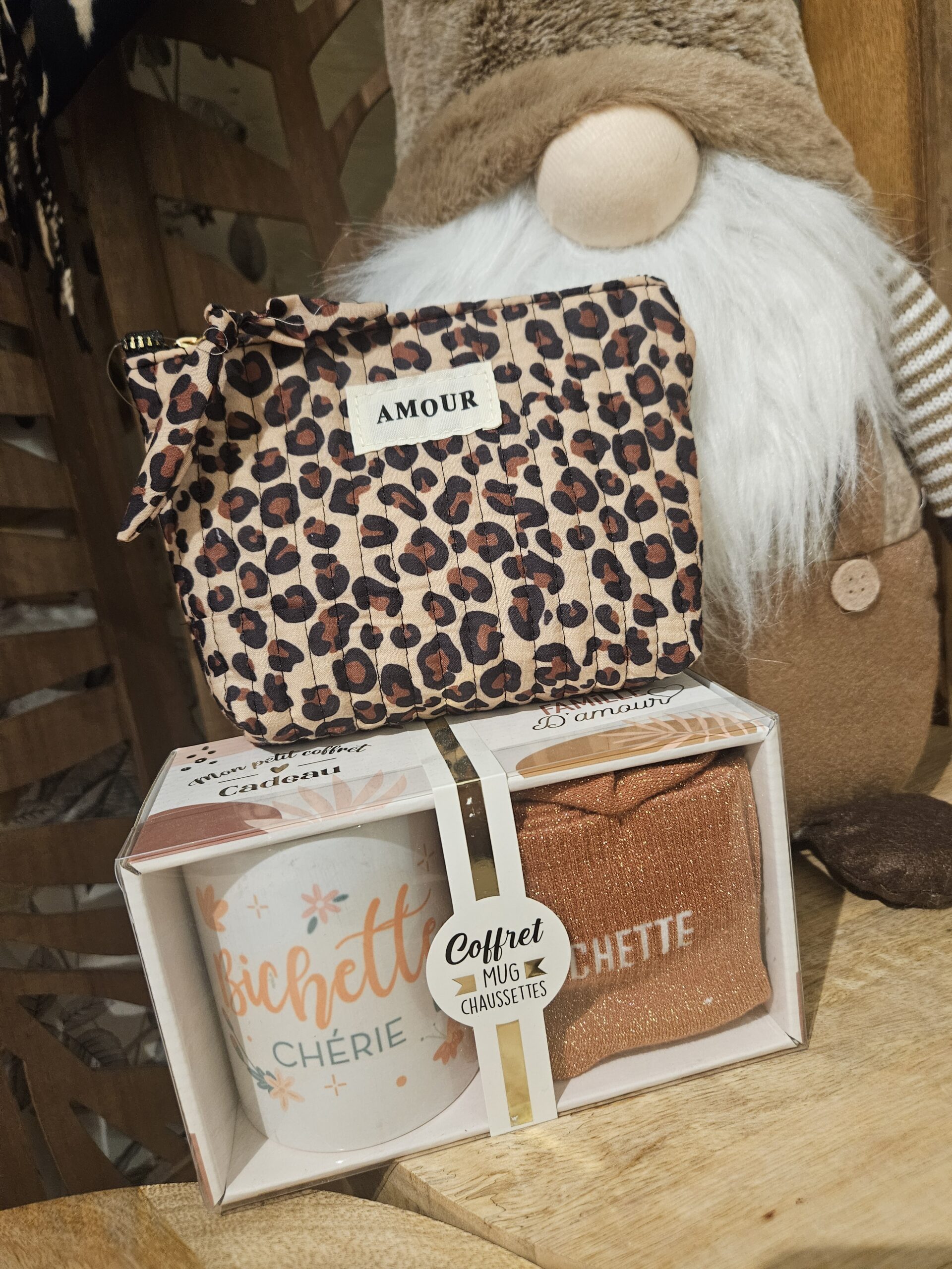 Coffret cadeau composé d’une paire de chaussettes pailletés « Bichette» ainsi que d’une pochette à message « Amour » et d’un mug« Bichette chérie.»
