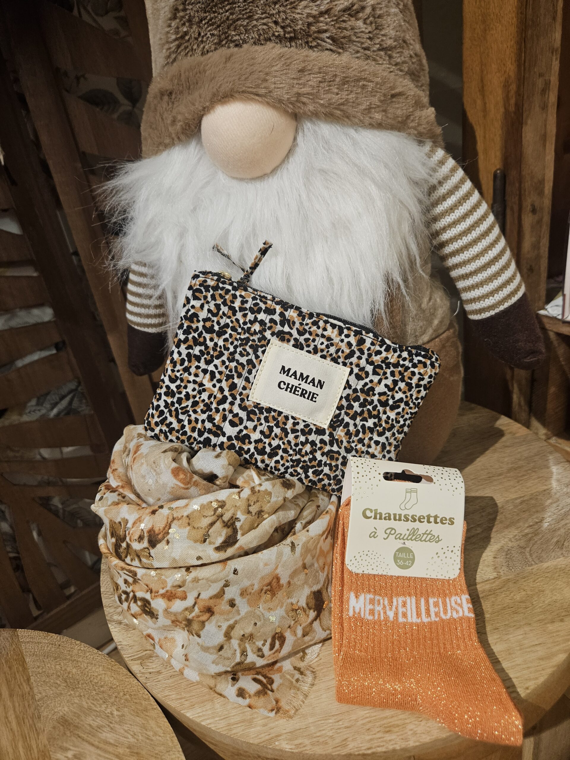 Coffret cadeau composé d’une paire de chaussettes pailletés « Merveilleuse » ainsi que d’une pochette à message « Maman chérie » et d’un foulard fleuri.