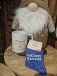 Coffret cadeau composé d’une paire de chaussettes pailletés « Meilleure marraine » ainsi que d’un mug « Meilleure marraine du monde ».