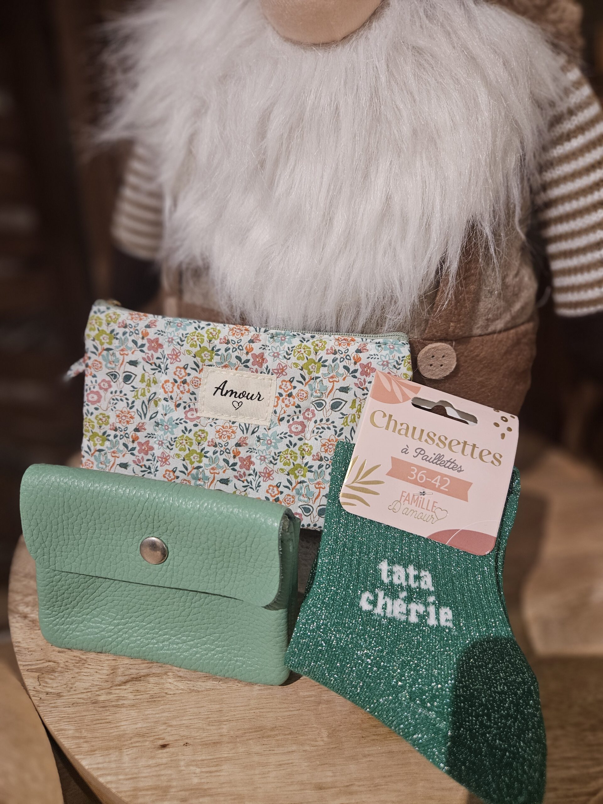 Coffret cadeau composé d’une pochette « Amour », d’une paire de chaussettes « tata chérie » ainsi que d’un porte-monnaie vert. Idéal pour faire plaisir à vos proches.