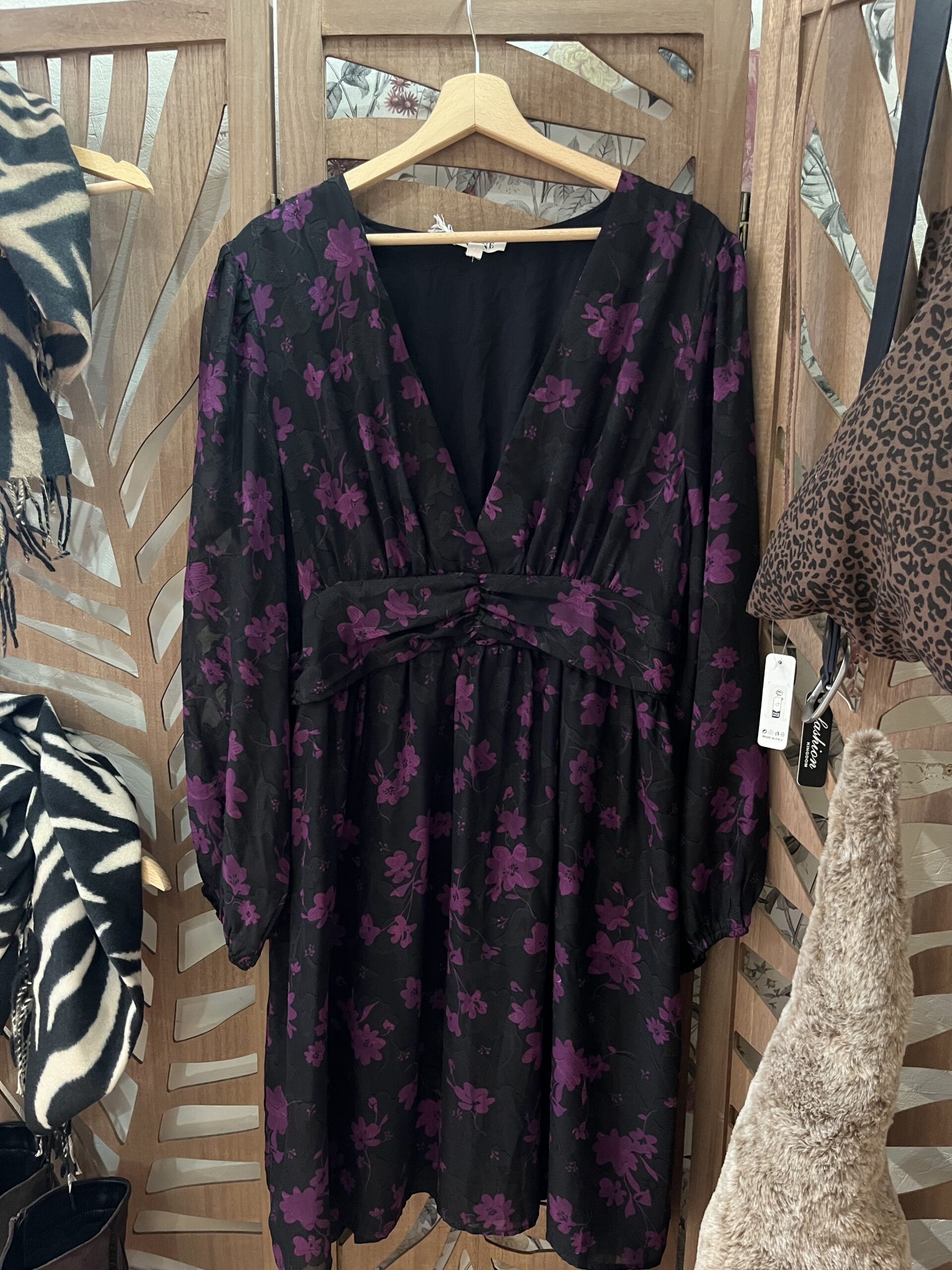 Robe courte col V, noir imprimé fleurs violettes. Coupe empire froncée sous poitrine, manches longues bouffantes, grandes tailles. Élégance féminine et fluide assurée.