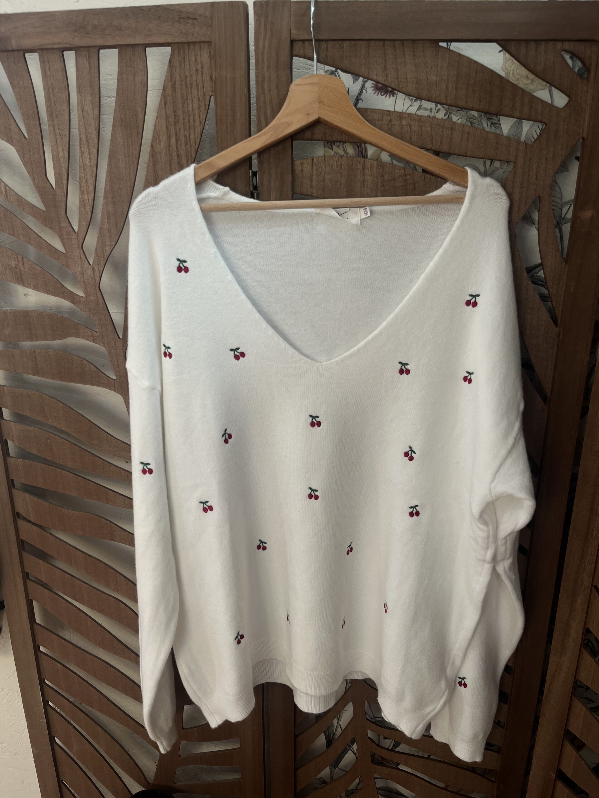 Joli pull léger en maille douce. Fond blanc parsemé de petites cerises rouges brodées.