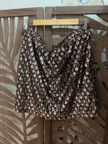Entièrement recouverte de sequins noirs brillants (pas de transparence, pas de démangeaisons), elle capte la lumière à chaque mouvement et vous fait scintiller comme une étoile. Coupe courte mais pas trop sage, taille mi-haute qui affine la silhouette et doublure douce pour un confort total.
