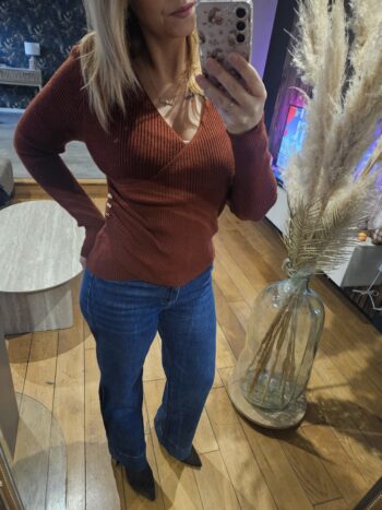 Pull fin en maille côtelée, col V cache-cœur avec boutons dorés décoratifs. Coupe ajustée, manches longues. Couleur terre brûlée chaleureuse et sophistiquée. Parfait avec jean ou jupe pour un look élégant et cosy. Taille unique.