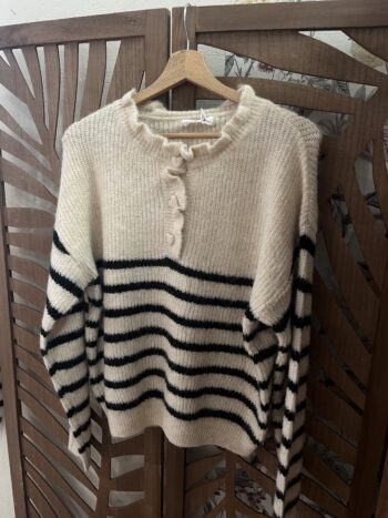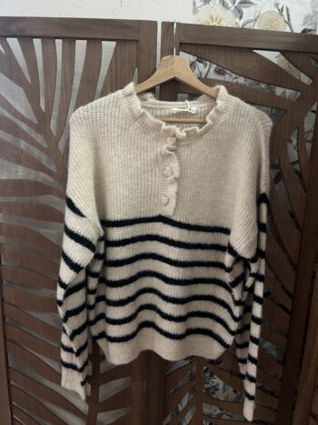 Pull marinière col volanté en maille douce – Écru & noir