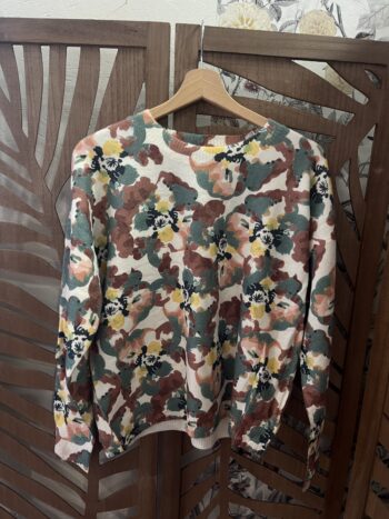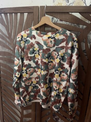 Magnifique pull doux et léger ultra confortable, sublimé par un imprimé floral oversize dans des tons automnaux très tendance : vert sauge, terracotta, moutarde, rose poudré et touches de noir sur fond crème.