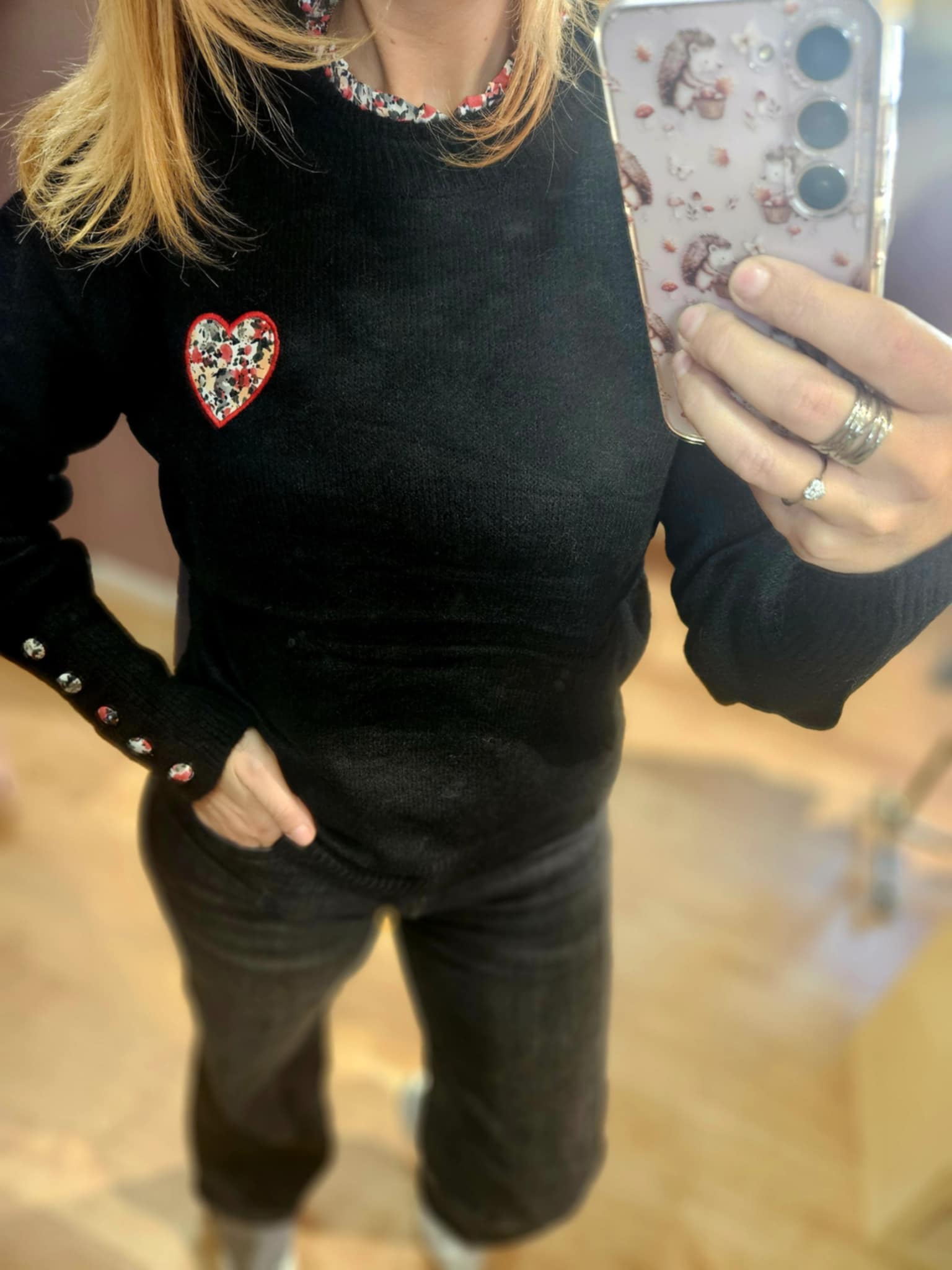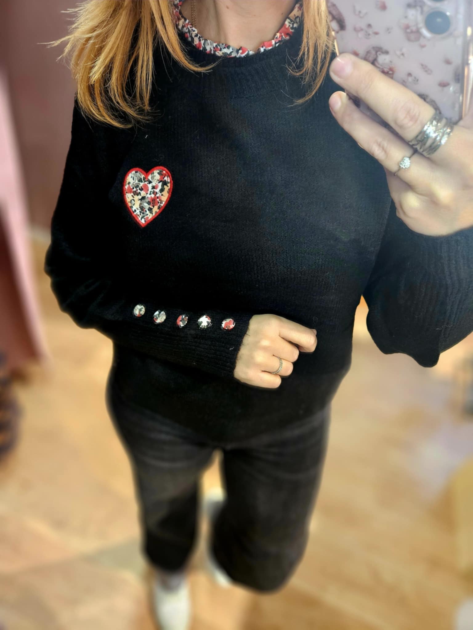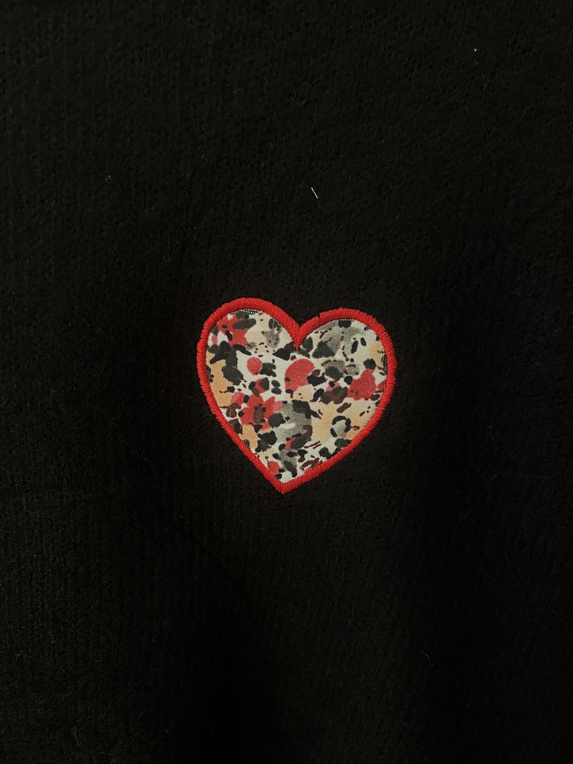 Pull fin noir col et cœur fleuri