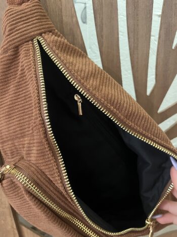 Sac banane en velours camel, pochette zippée à l’avant et à l’intérieur pour une organisation parfaite. Idéal pour apporter une touche de couleur à son look tout en étant pratique !