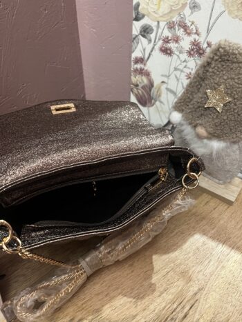 Sac à main rose doré irisé parfait pour accompagner vos looks de soirée. A la fois chic et étincelant il fera de vous la reine de la soirée. Un sac à la fois ravissant et pratique avec sa bandoulière et ses différents compartiments de rangement.