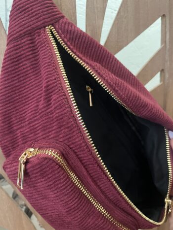Sac banane en velours rouge bordeaux, pochette zippée à l’avant et à l’intérieur pour une organisation parfaite. Idéal pour apporter une touche de couleur à son look tout en étant pratique !