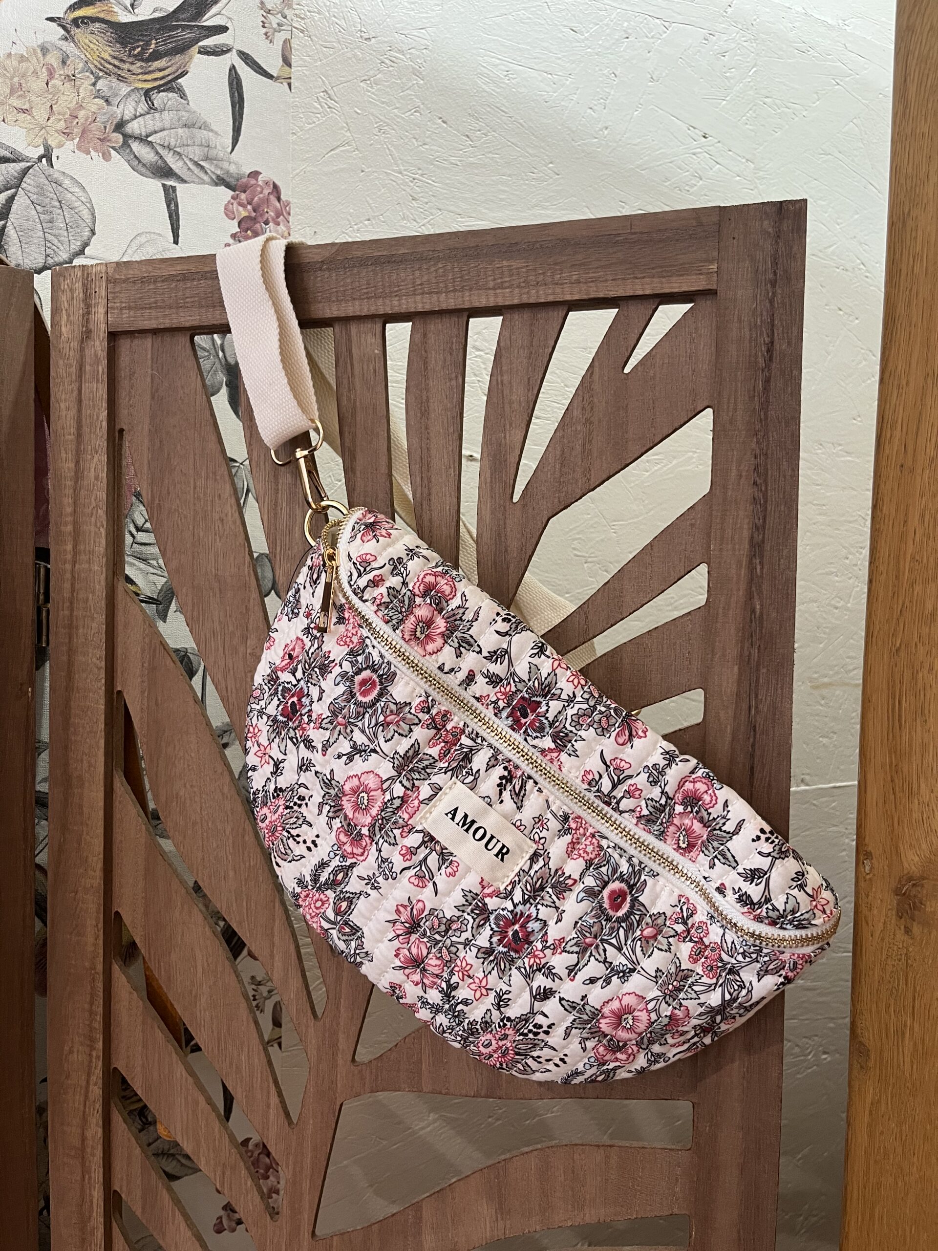Sac banane matelassé « AMOUR » fleuri rose poudré.