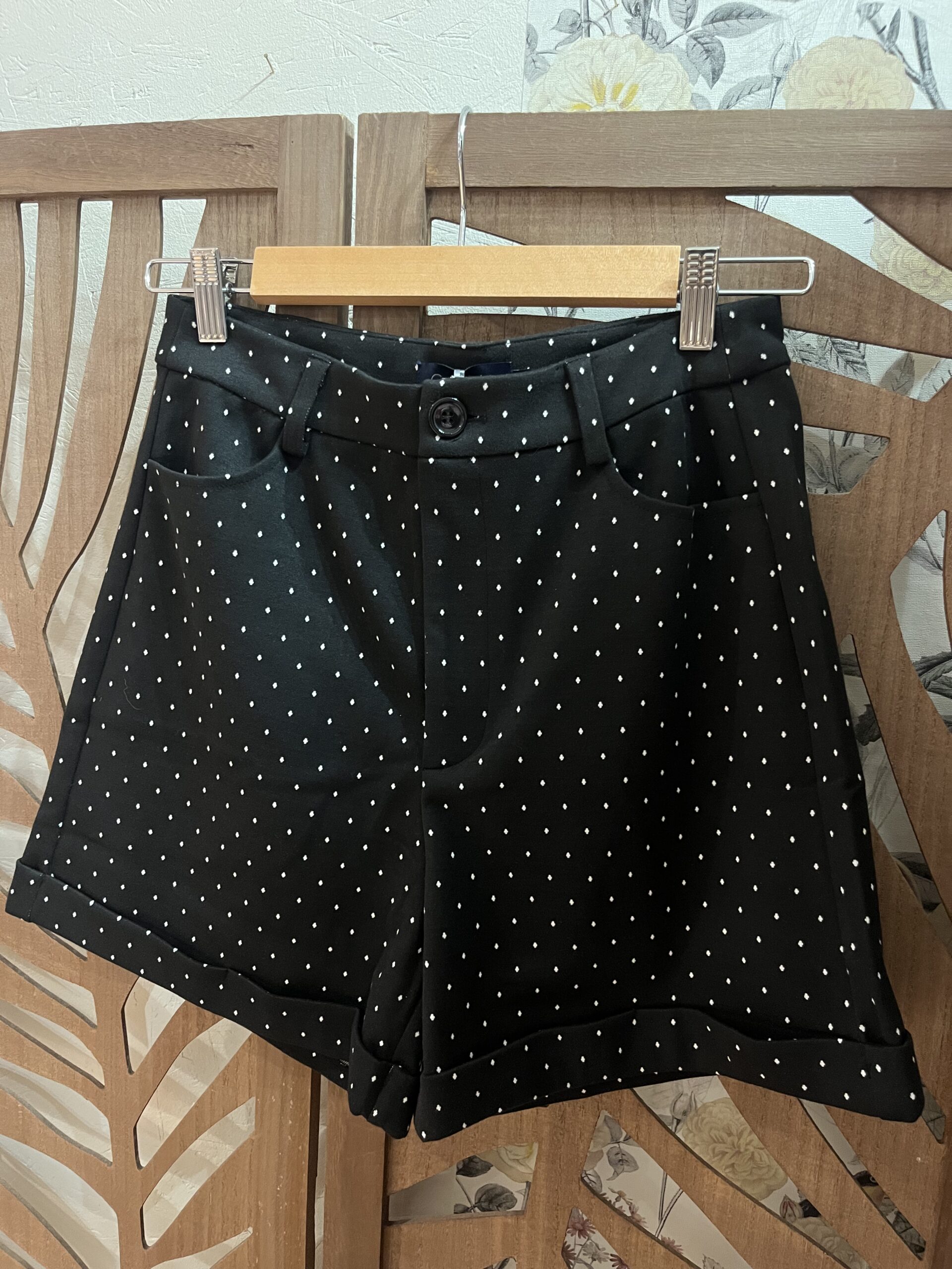 Fond noir intense, petits pois blancs parfaitement espacés, taille haute qui affine la silhouette et fait une taille de guêpe, revers aux jambes et vraies poches : tout y est pour un look à la fois sage-coquine irrésistible.