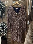 Robe courte col V, noir imprimé fleurs violettes. Coupe empire froncée sous poitrine, manches longues bouffantes, grandes tailles. Élégance féminine et fluide assurée.