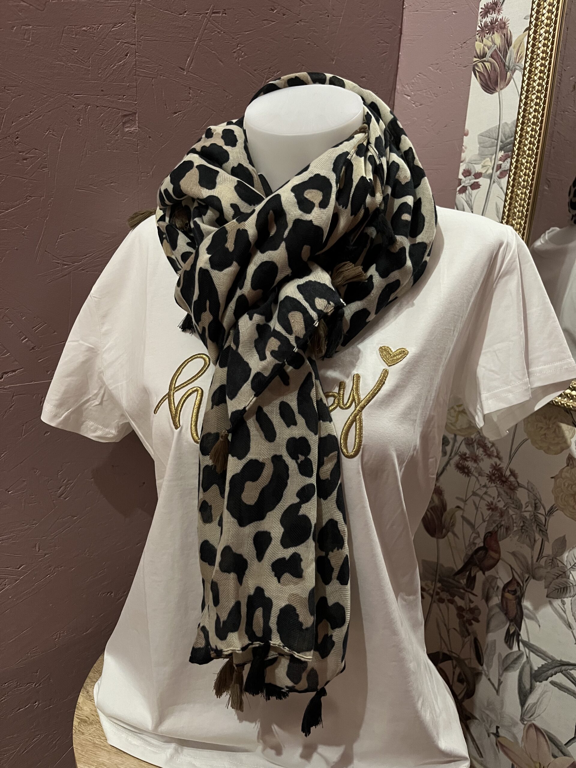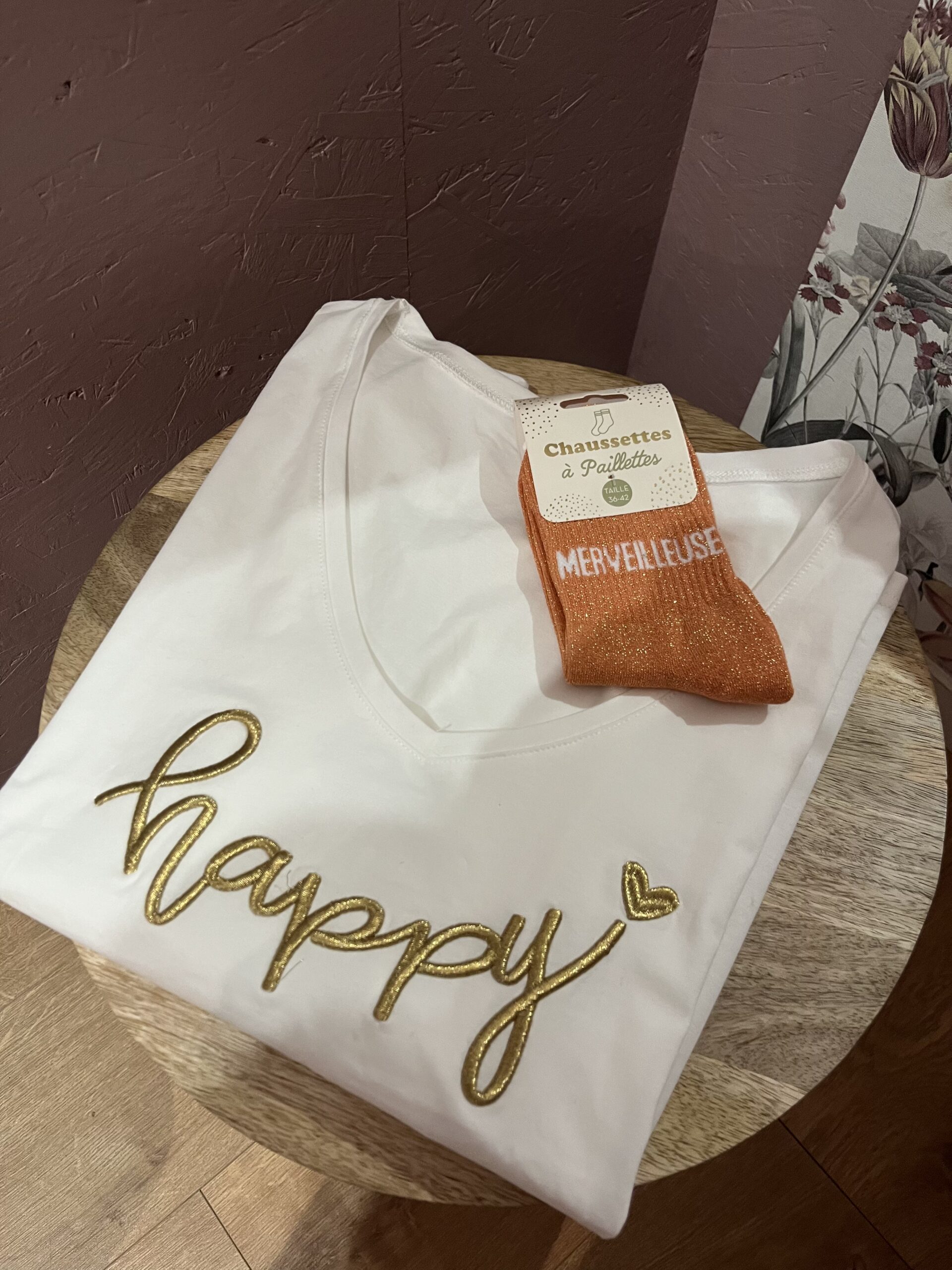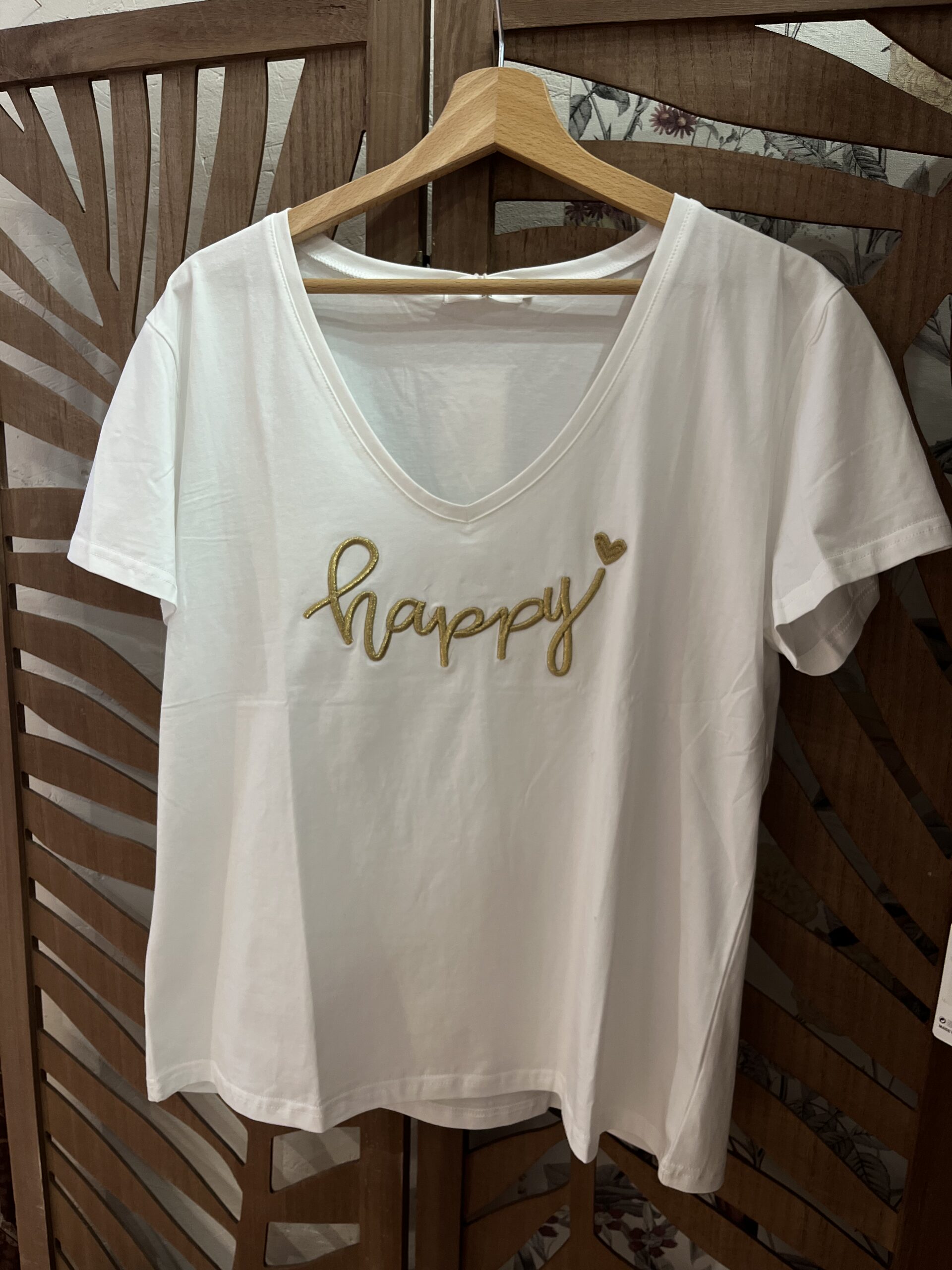 Apportez une touche de bonne humeur à votre quotidien avec ce t-shirt 100% coton tout doux ! Son col V légèrement échancré met subtilement la silhouette en valeur, tandis que le mot « Happy » brodé en fil doré scintillant et son petit cœur assorti illuminent instantanément votre look.